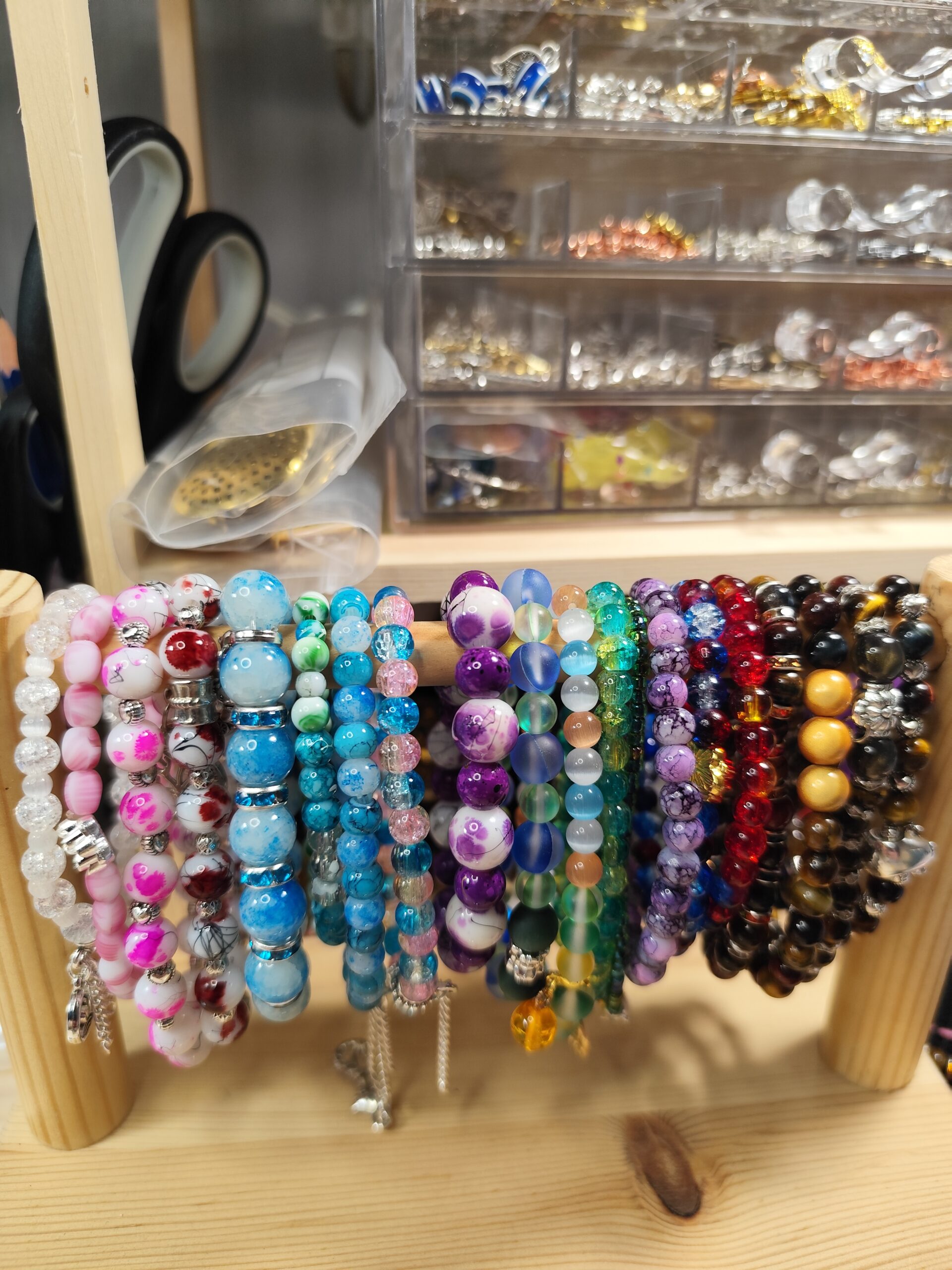 Klaashelmestest valmistatud käevõrud on minu looming, igaüks omamoodi. Erineva suurusega, ka mitu korda käivad ketid ümber käe, mis tavaliselt väiksematest helmestest tehtud. Enamasti on veniva tamiiliga tehtud aga tamiili jämedus on erinev. Osad käevõrud on lastepärased ja lõbusamad, mida tüdrukud heameelega kannaksid. Helkivad ja säravad kivikesed pakuvad lastele palju rõõmu.